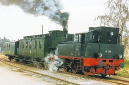 • Mehrere Dampfloks mit historischen Reisezugwagen beteiligten sich an zwei Tagen im April 1994 am Plandampf der Deutschen Bahn AG. Hier näherte sich die Lok 91 134 dem Haltepunkt Steinitz.