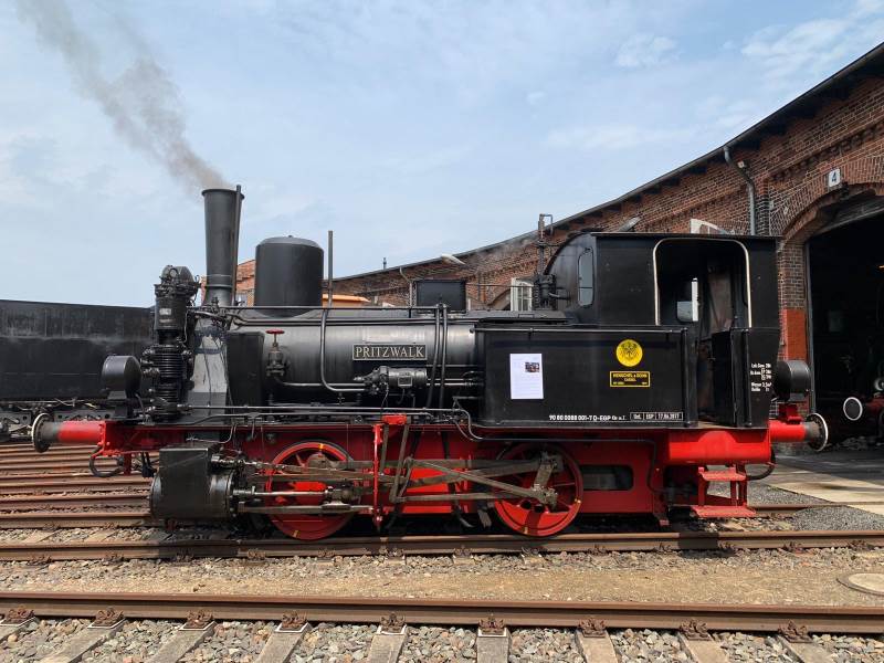 Bei der Dampflok "Pritzwalk" handelt es sich um eine Rangierlokomotive aus dem Hause Henschel, Kassel, die im Jahr 1912 unter der Fabriknummer 10802 gebaut wurde. Die Firma Henschel hatte seinerzeit einige Standardlokomotivtypen im Angebot, die sie nach den Einsatzorten der ersten Modelle des jeweiligen Typs benannte. Bei der "Pritzwalk" handelt es sich um eine Lok des Modells "Riebeck". Die Riebeckschen Montanwerke waren bis 1922 in der mitteldeutschen Braunkohleindustrie tätig und bestellten eben die ersten Schwestern der "Pritzwalk" als Rangierloks für ihre Werksanlagen. Die Lok "Pritzwalk" wurde an die Frankfurter Gasgesellschaft geliefert, die sie als Rangierlok in einem Werk zur Gewinnung von Stadtgas in Frankfurt einsetzte. Das Gas wurde seinerzeit aus Steinkohle gewonnen, die per Schiene angeliefert wurde. Nach der Entgasung blieb unter anderem Koks übrig, der per Schiene auch wieder abgefahren wurde. Für die Bereitstellung der entsprechenden Güterwagen wurde die "Pritzwalk" benötigt, die seinerzeit allerdings diesen Namen noch nicht trug. 1971 wurde die Lok abgestellt und an einen Autokran-Dienst in der Nähe von Frankfurt/M. verkauft, der sie als Denkmal aufstellen wollte. Der Plan wurde jedoch 1979 verworfen und die Lok wurde nach Wuppertal-Barmen verkauft, wo sie fortan als Blickfang vor einem Modellbahngeschäft stand. 1999 erwarb die Prignitzer Eisenbahn die Lok und ließ sie später aufarbeiten. Im Jahre 2004 erfolgten die ersten Probefahrten. Allerdings kam sie nachher nur in Ausnahmefällen zum Einsatz. Anlässlich des 25-jährigen Jubiläums des Vereins Dampflokfreunde Salzwedel e.V., des Trägervereins des Historischen Lokschuppens Wittenberge, wurde die Lok im Oktober 2019 nach Wittenberge transportiert und seit langer Zeit einmal wieder der Öffentlichkeit im Betrieb vorgeführt. |