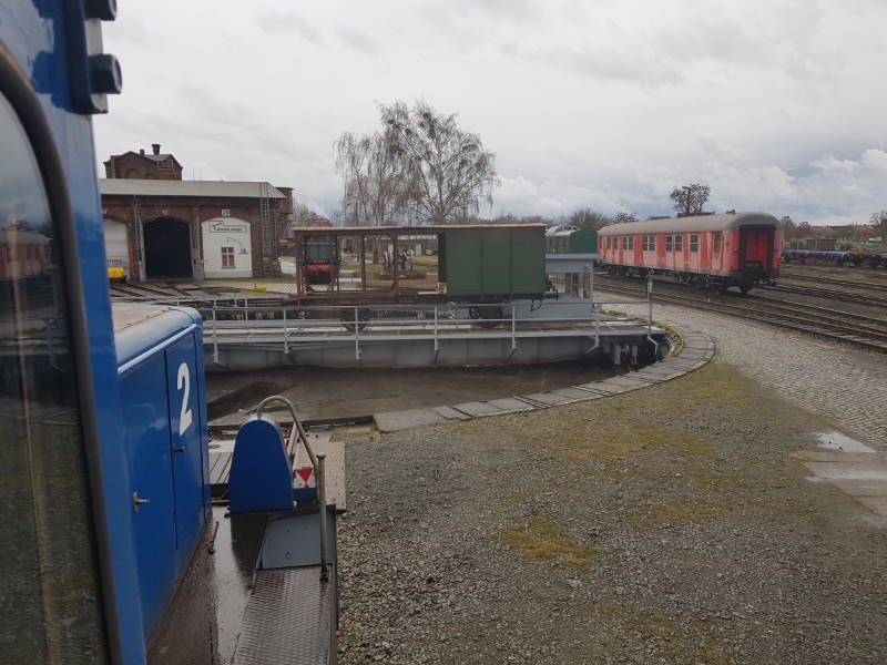Dann konnte unser in Aufarbeitung befindlicher Güterwagen mal wieder etwas frische Luft schnappen. Er wurde auf der Drehscheibe gedreht, damit die bislang unverkleidete Hälfte im Schuppen bearbeitet werden kann.