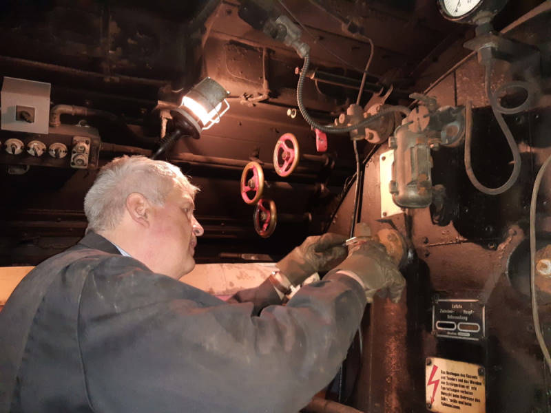 Schweiß lief auch bei weiteren Arbeiten an der Dampflok 50 3570. Hier wurde ein aufgearbeitetes Abschlammventil unter dem Kessel montiert und Wasserstandsanzeigen im Führerstand angeschraubt.