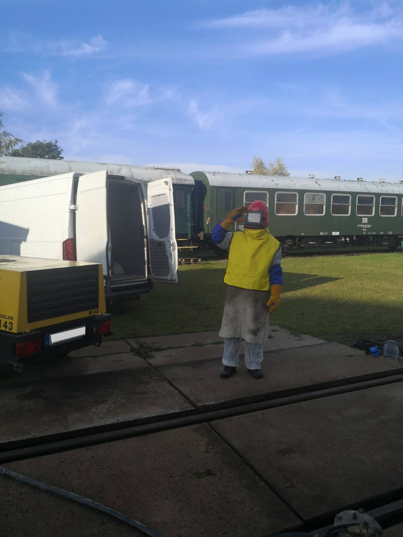 Nein, es sind keine Marsmännchen gelandet. Vielmehr wurde der Tender der Lok am Mittag in unser Außengelände gefahren, um ihn sandstrahlen zu können. Dabei werden die Metalloberflächen mit einem Granulat beschossen, das den Rost ablöst. Bei diesen Arbeiten muss man einen Schutzanzug tragen, weil die herumwirbelnden Körnchen zu Verletzungen führen können.