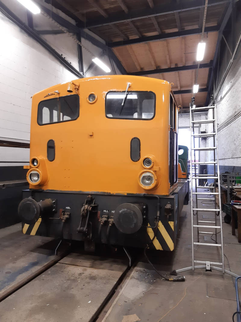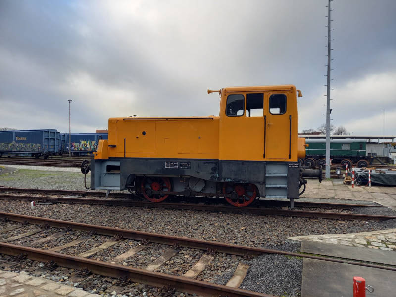Zunächst nimmt die farbliche Gestaltung der Diesellok V23 Formen an, die zukünftig die Nummer 102 076 tragen wird. Der obere Teil der Lok ist inzwischen orange lackiert. Die schwarze und graue Farbe am Fahrwerk wird noch ausgebessert. Dann werden die Lokschilder angebracht, die über die Nummer und den Heimatstandort Wittenberge Auskunft geben. Die Lok soll zukünftig mit dem Beiwagen 197 805 eingesetzt werden, über dessen Aufarbeitung wir weiter unten berichten.