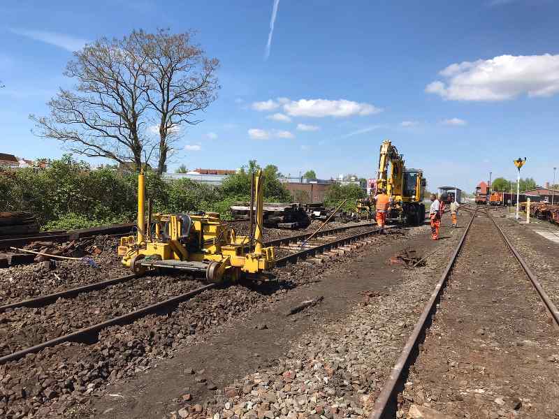 In der Woche vor der Veranstaltung stand noch eine planmäßige Gleisunterhaltung auf dem Programm, in deren Rahmen diverse Holzschwellen gegen solche aus Beton ersetzt wurden. Außerdem wurden noch Reste von Weichen und Kreuzungen ausgebaut, die heute keinem Zweck mehr dienen.