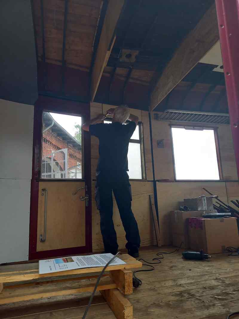 Deutlich ruhiger, aber trotzdem emsig wurde in dem Beiwagen 197 805 gearbeitet. Hier ging der Innenausbau an den Wänden weiter.