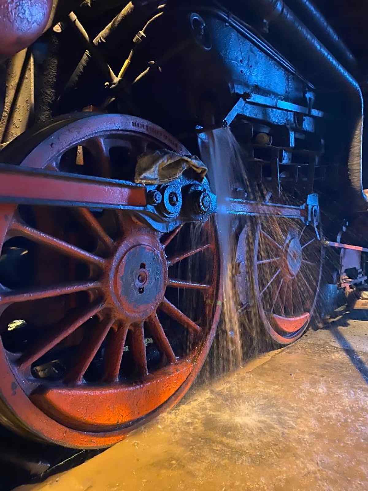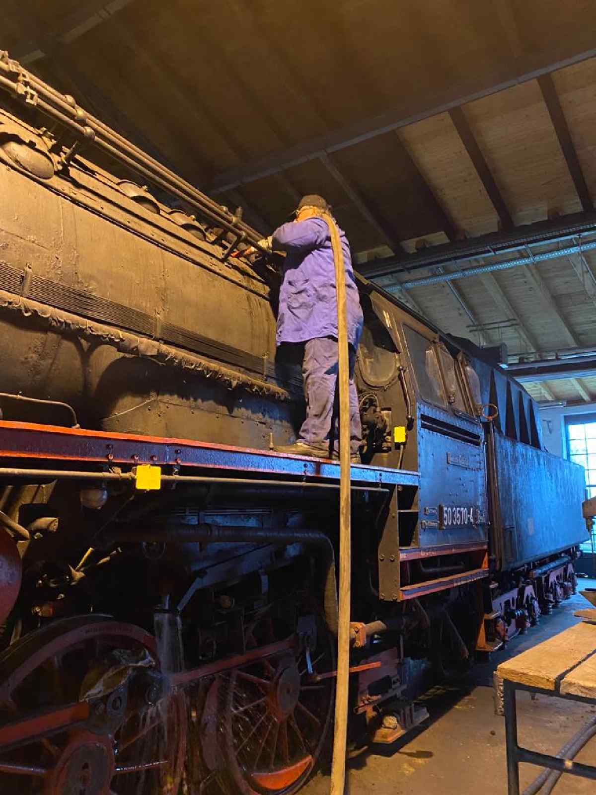 Was geschah an diesem Wochenende sonst noch? Nach Abschluss der Saison müssen unsere betriebsfähigen Fahrzeuge in den Winterschlaf versetzt werden. Am Samstag wurde deshalb der Kessel der 50 3570 ausgewaschen. Das bedeutet, dass die Rückstände, die beim Verdampfen des Wassers im Kessel zurückgeblieben sind, mit einem scharfen Wasserstrahl herausgewaschen werden.