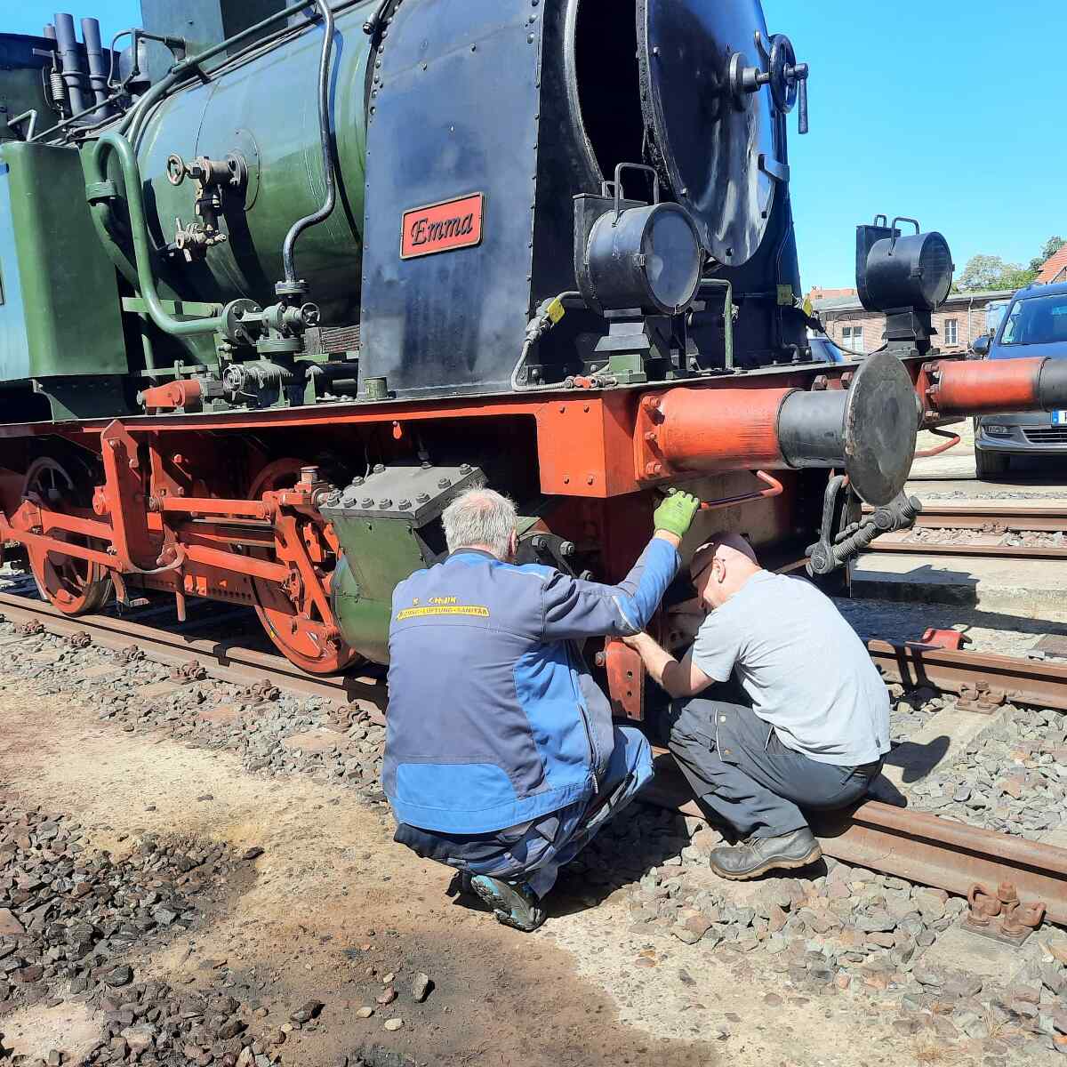 Nebenbei wurde noch die Dampflok Emma komplettiert, nachdem sie vom Transport zu ihrem Einsatz in Luckau (siehe letzter Newsletter) zurückkehrte.