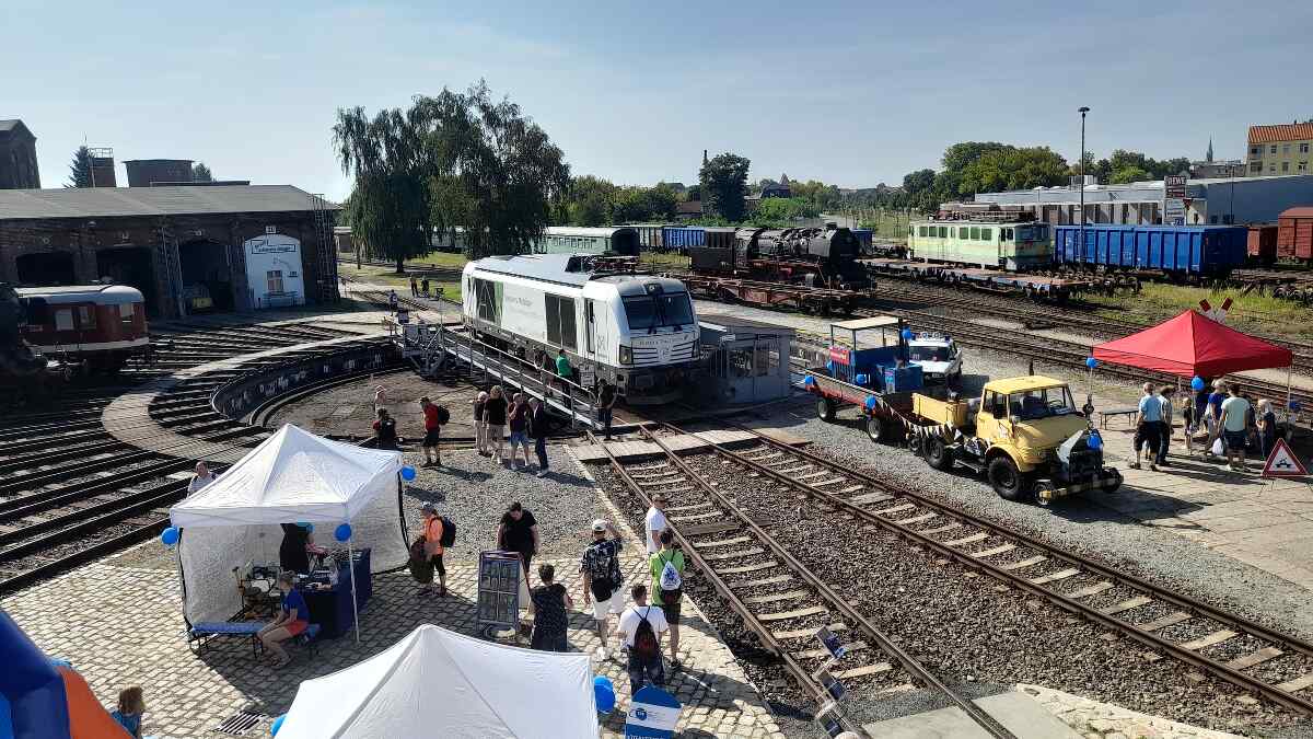 Was ist sonst noch geschehen? Wir hatten am vergangenen Wochenende drei Veranstaltungen zu absolvieren und das war nicht nur aufgrund des sommerlichen Wetters ziemlich anstrengend. Am 9.9. öffneten unsere Nachbarn, die Schienenfahrzeugwerke Wittenberge, ihre Tore für Interessierte. Dabei haben wir natürlich unterstützt, weil wir uns ja eigentlich das Gelände des ehemaligen Bahnbetriebswerkes Wittenberge teilen. Wir denken auch, dass wir uns gut ergänzt haben, denn die SfW zeigten moderne Technik, wir dagegen die historische.