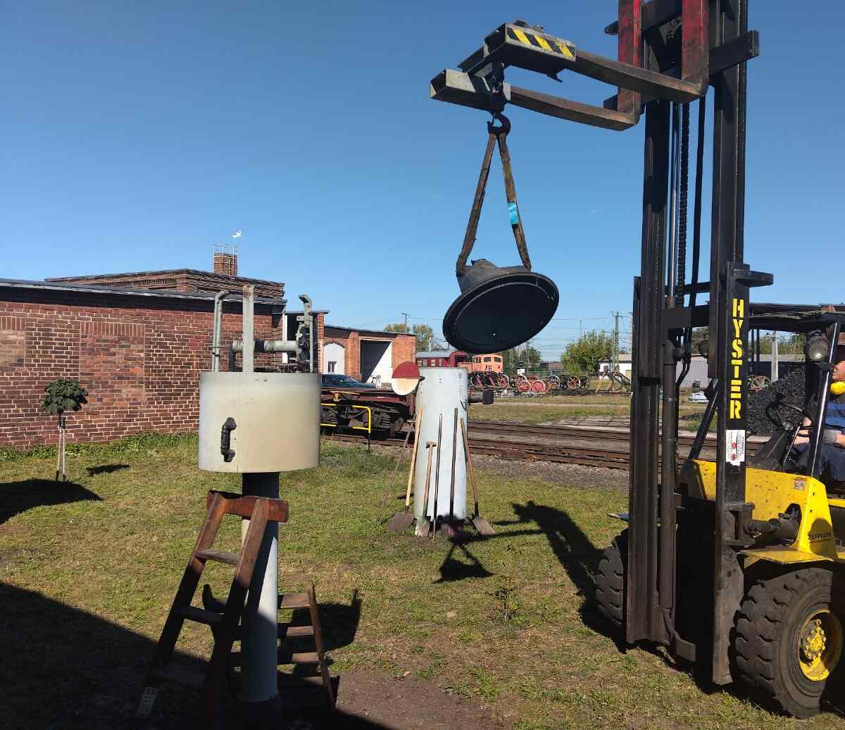 Am Sonntag fand dann der bundesweite Tag des offenen Denkmals statt. Auch hieran haben wir uns beteiligt und konnten etlichen Besuchern über unsere Aktivitäten zum Erhalt unseres Denkmals berichten. Heute können wir auch über eine weitere kleine Sensation berichten. Zwar ist leider der bekannte Stendaler Fachbuchautor und Eisenbahnliebhaber Wolfgang List vor einiger Zeit verstorben. Wir konnten uns aber mit der Familie dahingehend verständigen, dass unser Museum die umfangreiche Sammlung von Läutewerken übernimmt und ausstellt. Dabei handelt es sich um diverse, teilweise telefonzellengroße Geräte, die vor der Digitalisierung der Eisenbahn der Meldung von ankommenden und abgehenden Zügen per Morsezeichen dienten. Wolfgang List hatte solche Anlagen aus etlichen Teilen Deutschlands vor der Verschrottung bewahrt und in seiner Privatsammlung funktionsfähig restauriert. Nun bekommen die Teile in Wittenberge ihren würdigen Platz. Wir danken den Angehörigen noch einmal sehr herzlich für ihre Bereitschaft, uns die Sammlung zu übergeben. Wir haben vor einigen Tagen mit der Aufstellung der großen Ausstellungsstücke in unserem Freigelände begonnen.