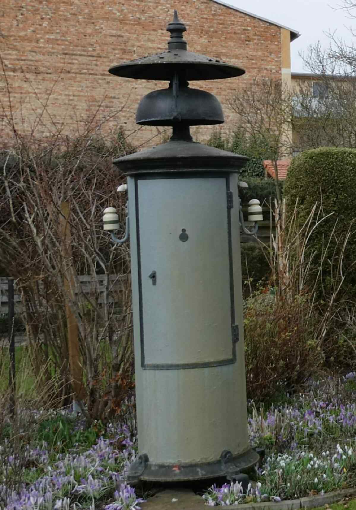 Oder sie waren auf eigens für die Läutewerke hergestellten Gerätehäusern befestigt, welche die Größe einer Telefonzelle erreichen konnten. Dabei gab es wiederum unterschiedliche Ausführungen aus Holz oder Metall, je nach Hersteller und Bahngesellschaft, die sie einsetzte.